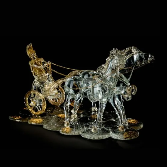 Carroza con figura tirada por 2 caballos en cristal color oro de 24k sobre base de cristal con pan de oro de 24k.