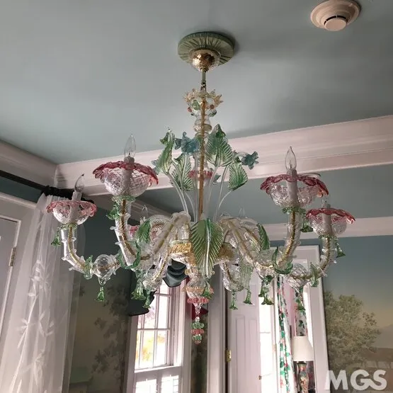 Hermosa araña hecha en Murano en estilo Ca 'Rezzonico, vidrio con decoración de oro de 24 k, detalles en verde, rosa y azul claro.