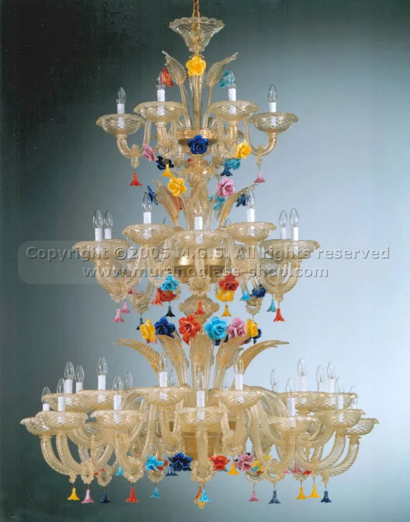 La lámpara es de tres niveles de alrededor de 24 luces en la parte baja, 12 en la central y los seis primeros.